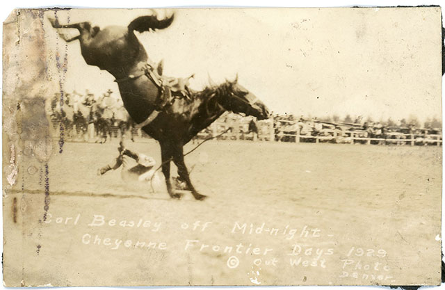 This black gelding was foaled on the Cottonwood Ranch in the Porcupine Hills, west of Fort Macleod, Alberta, in 1916. His mother was a thoroughbred mare; his sire a Percheron/Morgan cross. Due to the horse’s unreliable nature, Midnight’s owner, Jim McNab gave up on making the gelding into a saddle horse and decided to try him as a bucking horse at some of the local rodeos around the country. His reputation quickly grew as he reportedly bucked off all contestants until Pete Knight rode him in 1926.