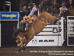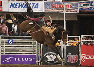 A talented bareback rider from Balzac, Alberta became the first Canadian to top the $100,000 mark in season earnings as he qualified for one of his twenty CFR appearances (including bull riding) and won the $50,000 at the Calgary Stampede.