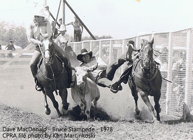 Dalemead, Alberta cowboy, the late Dave MacDonald, wrote his name in professional rodeo’s record book, by qualifying for the Canadian Finals Rodeo in three events—bareback riding, calf roping and steer wrestling—in the same year (1975). He was, and still is, the only contestant to have done so.