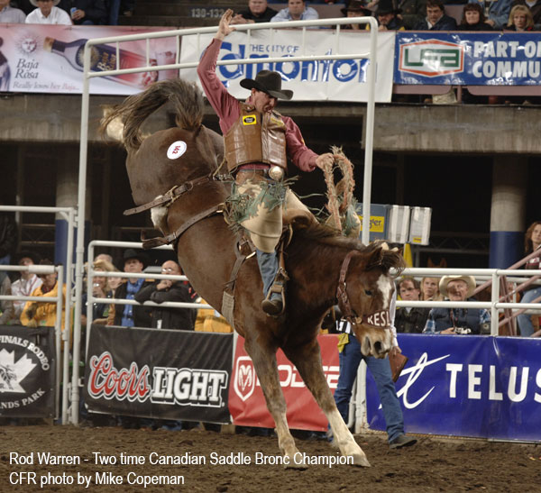 Valleyview, Alberta bronc rider and steer wrestler Rod Warren earned his fourth Saddle Bronc Aggregate (average) win at the National Finals Rodeo. (He was the only NFR saddle bronc rider to ride all 10 head that year.) Quite an accolade considering contestants compete ten consecutive days against exceptional stock and the greatest rodeo athletes anywhere.