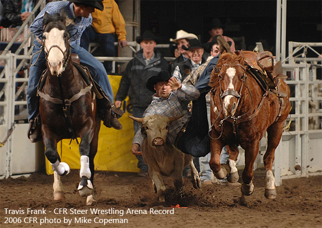 Talk about handling rookie jitters. First time CFR steer wrestling qualifier, Travis Frank, rode into the box at the first performance of the '06 Canadian Finals Rodeo and moments later, the Coliseum score clock blazed the news that the Stony Plain, Alberta cowboy had just set a CFR arena record at 3.1 seconds!