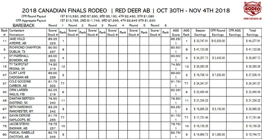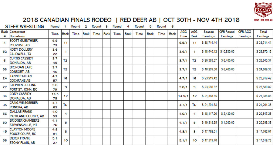 T1. RILEY WARREN, STETTLER, AB, $9,180.00 T1. SHANE HANCHEY, SULPHUR, LA, $9,180.00 3. LOGAN BIRD, NANTON, AB, $5,130.00 T4. LEE ROMBOUGH, SEXSMITH, AB, $1,755.00 T4. STETSON VEST, CHILDRESS TX, $1,755.00 |
