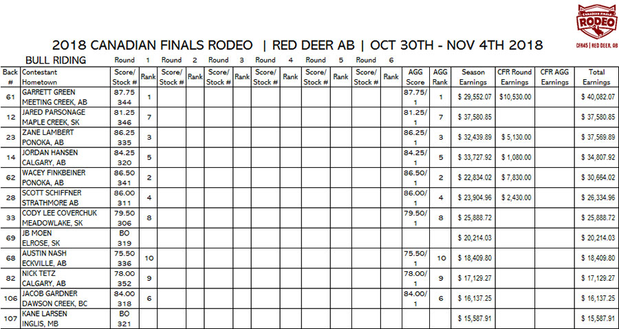 1. GARRETT GREEN, MEETING CREEK, AB, $10,530.00 2. WACEY FINKBEINER, PONOKA, AB, $7,830.00 3. ZANE LAMBERT, PONOKA, AB, $5,130.00 4. SCOTT SCHIFFNER, STRATHMORE AB, $2,430.00 5. JORDAN HANSEN, CALGARY, AB, $1,080.00 |