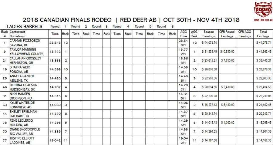 1. TAYLOR MANNING, YELLOWHEAD COUNTY, AB, $10,530.00 2. CALLAHAN CROSSLEY, HERMISTON, OR, $7,830.00 3. KYLIE WHITESIDE, LONGVIEW, AB, $5,130.00 4. BERTINA OLAFSON, HUDSON BAY, SK, $2,430.00 5. RENE LECLERCQ, HOLDEN, AB, $1,080.00 |
