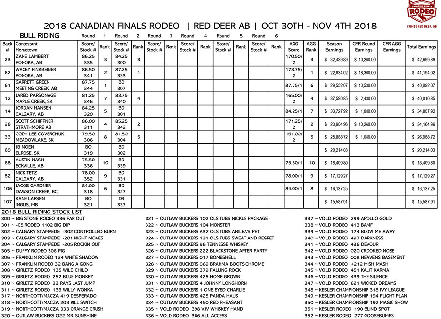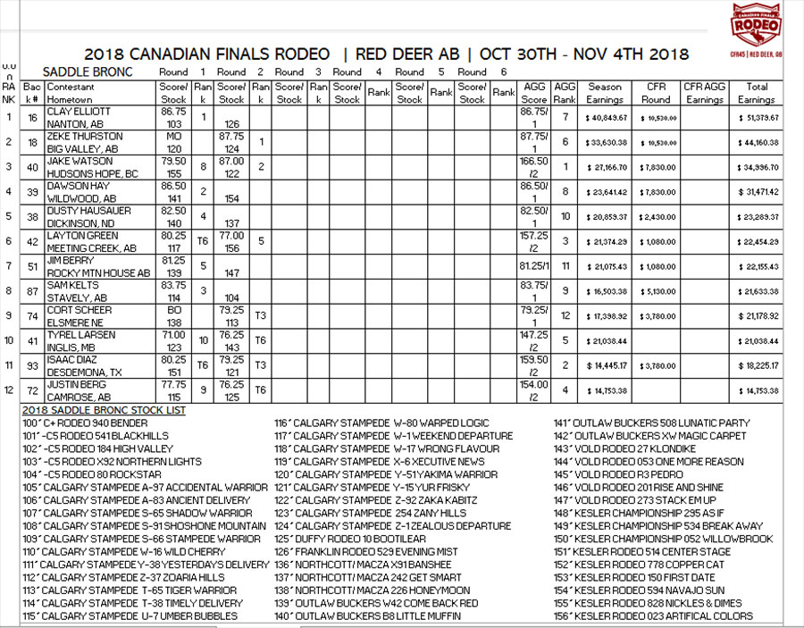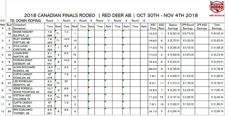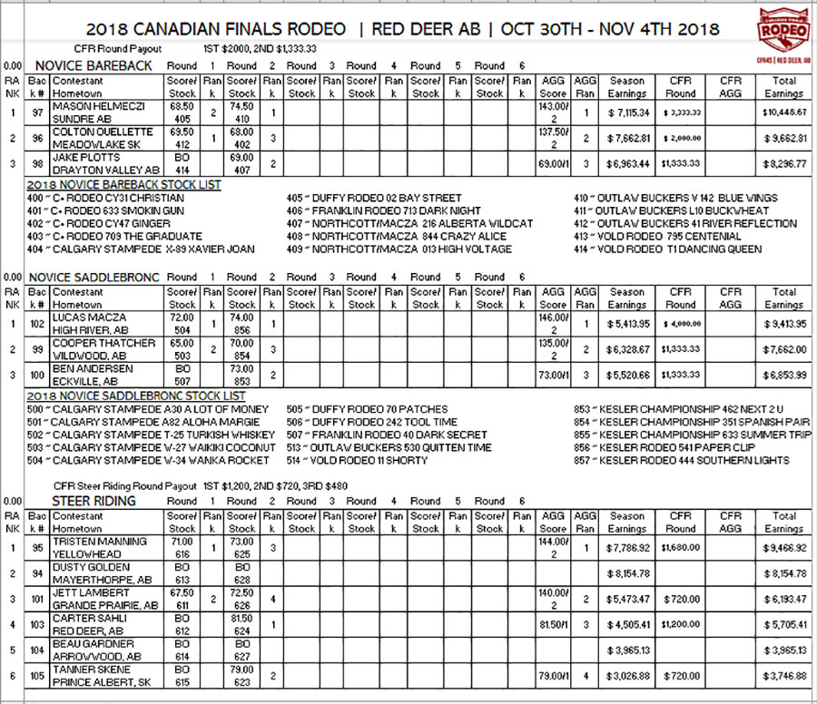CANADIAN FINALS RODEO Round by Round Results after the second performance