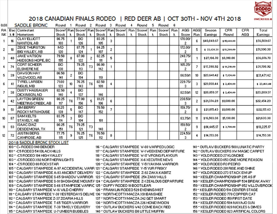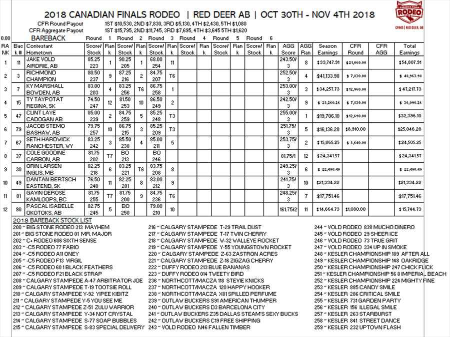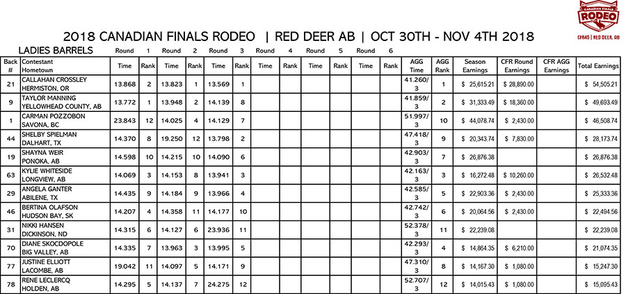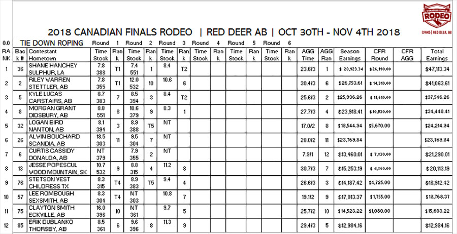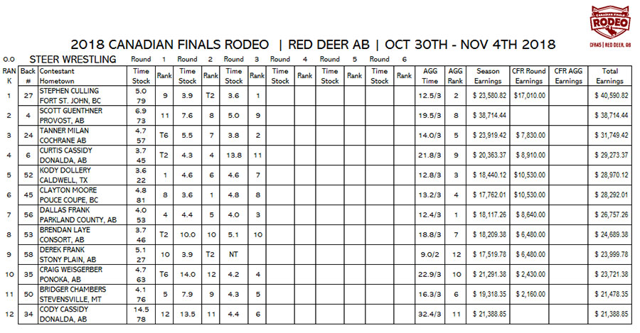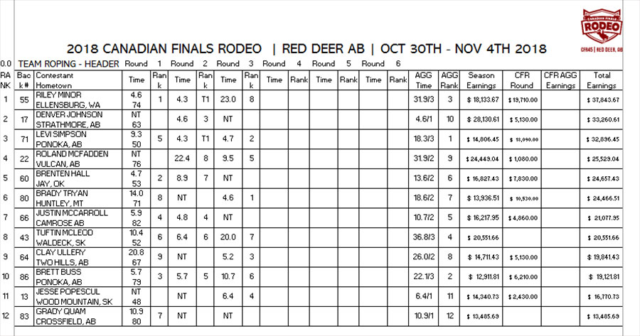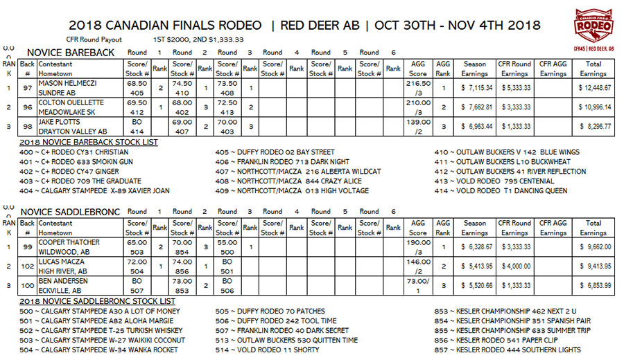 CANADIAN FINALS RODEO Round by Round Results after the third performance