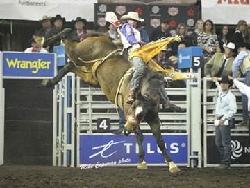Edmonton, AB (Nov 6, 2014) – A year ago Matt Lait won his first Canadian Championship. This year, the 9 time CFR bareback riding qualifier had what he describes as a ‘middle of the pen’ kind of year… coming into the 2014 CFR in 7th spot. Tonight, in CFR go round 2, Lait made a big move on Calgary Stampede’s Unfortunate Carma – riding for 87 points to collect the first place cheque and move to number two in the overall standings.