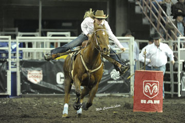 LADIES BARREL RACING (CFR earnings to date) 1. Sydney Daines, Red Deer County, AB, 14.622, $11,809.44; 2. Brook Robertson, Ponoka, AB, 14.640, $9,992.60; 3. Steffanie Mather, Medicine Hat, AB, 14.752, $14,534.70; 4. Lisa Zachoda, Okotoks, AB, 14.812, $2,725.26; 5. Julie Leggett, Kamloops, BC, 14.897, $1,211.22