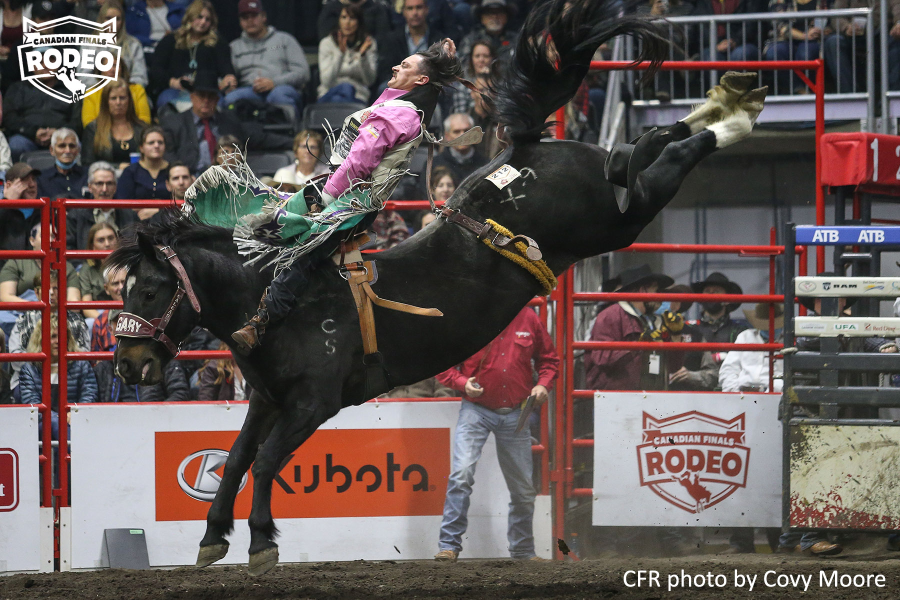Veteran Canadian bareback rider Ty Taypotat made the most of his match-up with the 2021 World Champion Bareback Horse, Calgary Stampede’s Xplosive Skies (88.5 points) to win the Saturday night 5th round of the CFR.