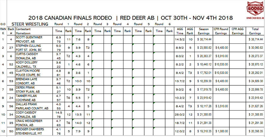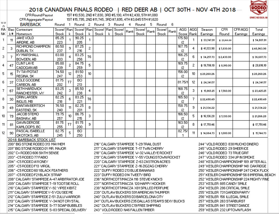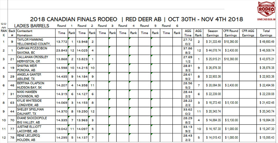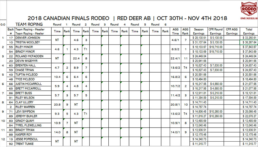 CANADIAN FINALS RODEO Round by Round Results after the second performance